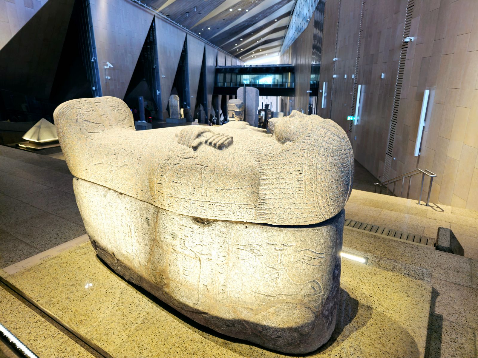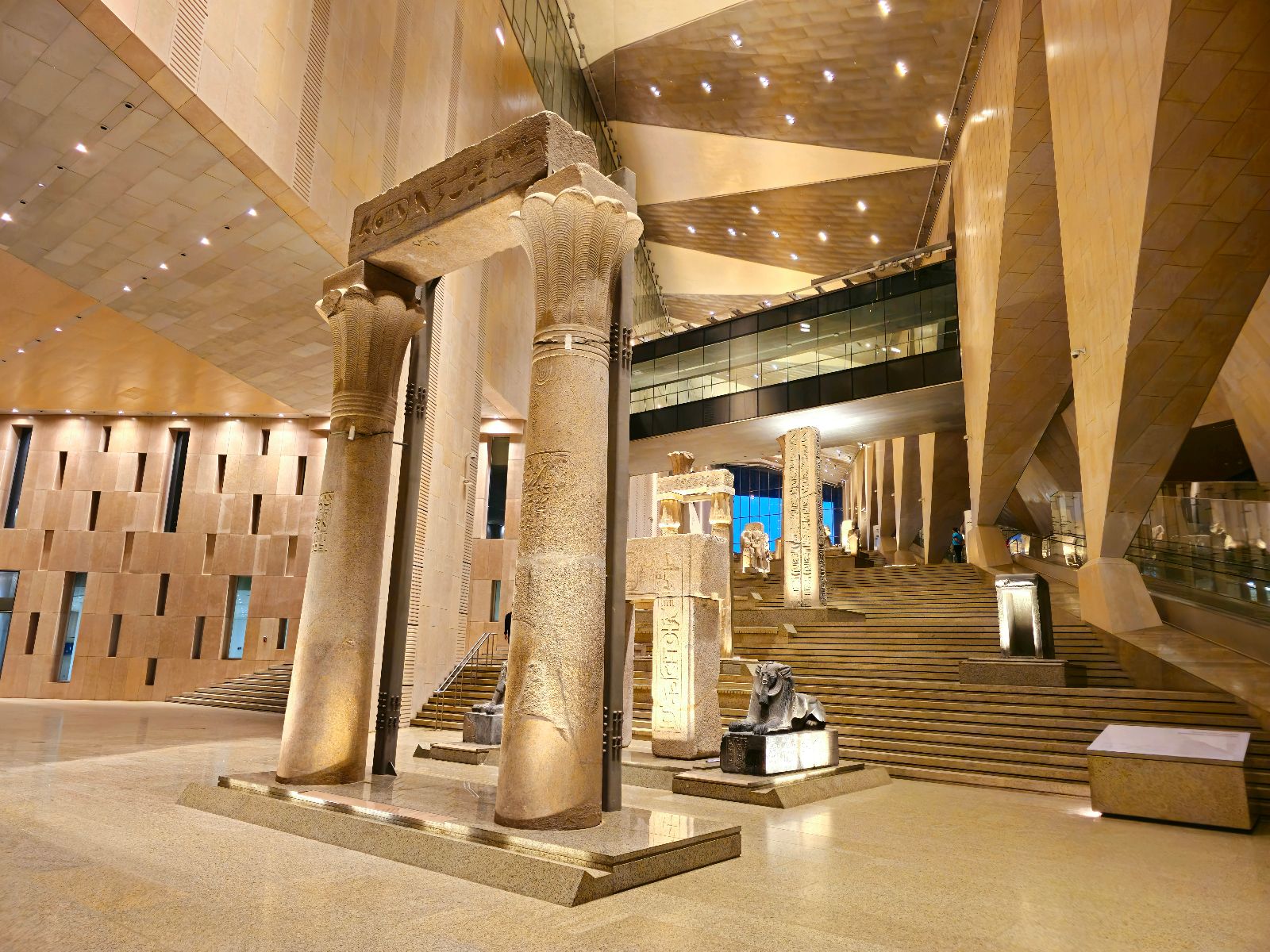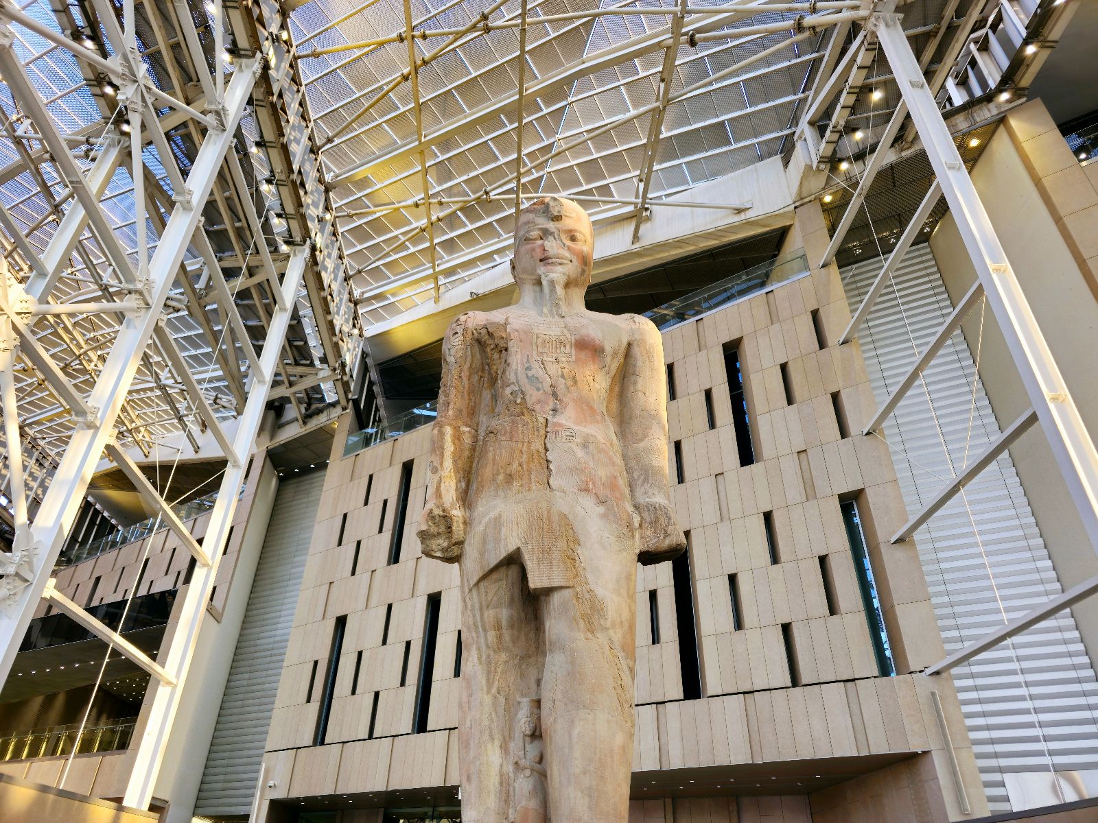 The museum’s architecture embodies Egypt’s balance between heritage and innovation. Its façade of translucent alabaster and sand-colored stone glows under the desert sun, while vast glass walls allow natural light to illuminate monumental statues within.