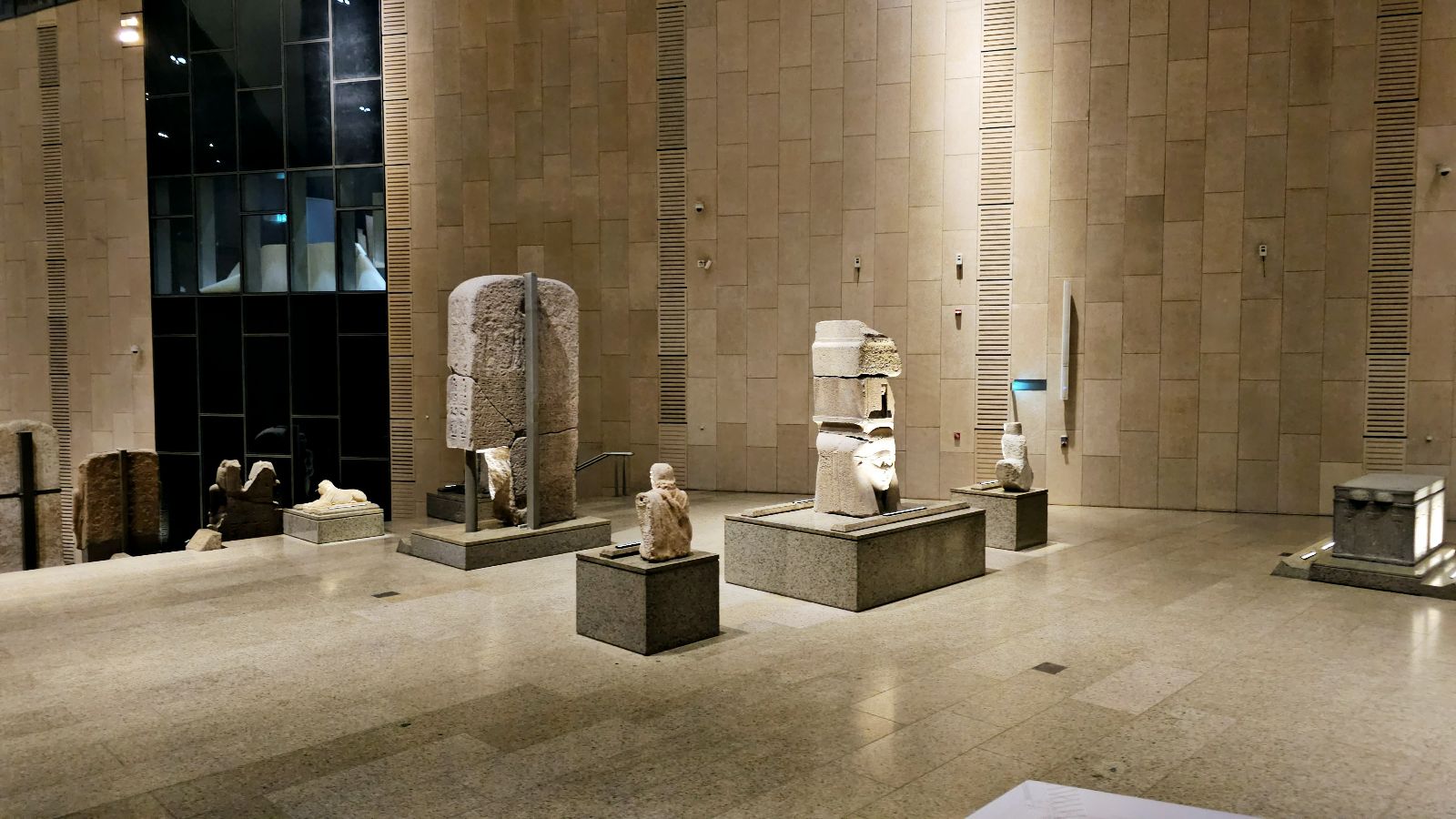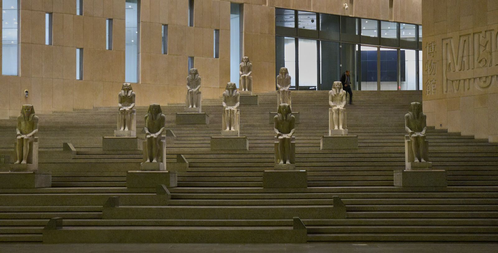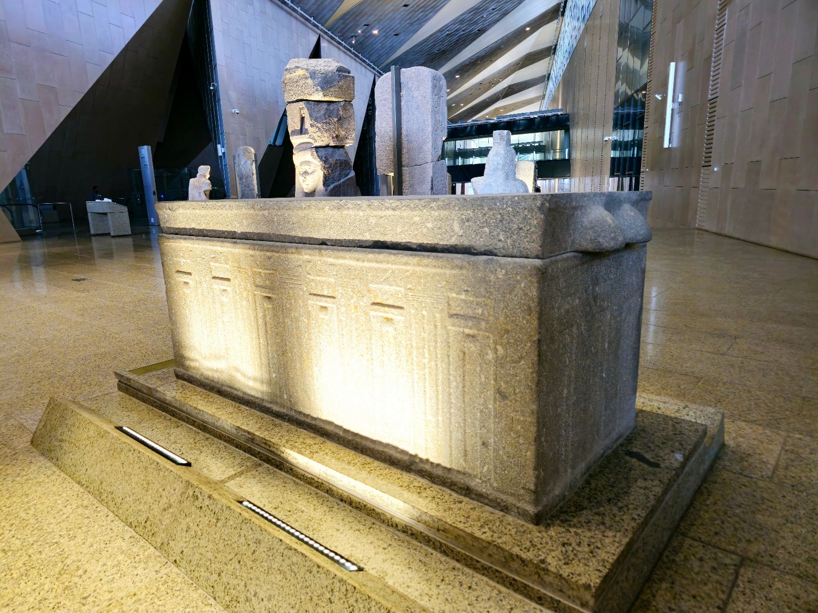 The museum’s architecture embodies Egypt’s balance between heritage and innovation. Its façade of translucent alabaster and sand-colored stone glows under the desert sun, while vast glass walls allow natural light to illuminate monumental statues within.
